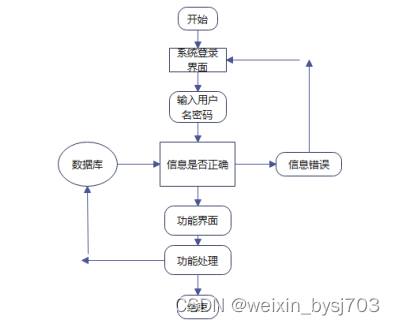 用户打开并进入系统后,会先显示登录界面,输入正确的用户名和密码,系统自动检测信息,若信息无误,则用户会进入系统功能界面,进行操作,否则会提示错误无法登录,操作流程如图3-3所示。