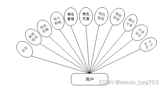 (2)用户,主要功能有:首页、新闻资讯、我的(商品资源、加入购物、钱包管理、钱包充值、钱包提现、地址管理、确认订单、订单支付、个人中心)管理等,如图3-2所示。