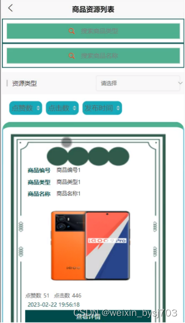 商品资源列表页面,在商品资源列表页面可以查看商品编号、商品类型、商品名称、商品价格、新旧程度、资源类型、商品图片、卖家图像等信息,可以进行点赞、收藏、评论加入够买车等功能操作,如图5-4所示。