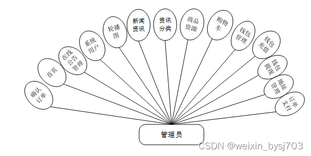 (1)管理员模块:系统中的核心用户是系统管理员,管理员登录后,通过管理员菜单来管理后台系统。主要功能有:首页、在线公告管理(在线公告)、系统用户(管理员、学生用户)、轮播图(轮播图管理)、资源管路(新闻资讯、资讯分类)、模块管理(商品资源、购物车、钱包管理、钱包充值、钱包提现、地址管理、确认订单、订单支付)等。管理员用例图如图3-1所示。