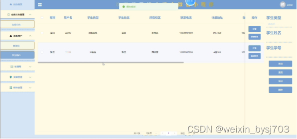 用户管理,在用户注册管理页面中可以对账户、密码、确认密码、昵称、邮箱、手机、身份、学生姓名、所在校区、联系电话、详细地址、微信号码、学生学号等信息进行添加、删除或详细等操作,如图5-9所示。
