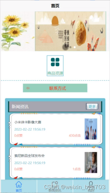 毕业清仓微信小程序,在系统首页可以查看首页、新闻资讯、我的(商品资源、加入购物、钱包管理、钱包充值、钱包提现、地址管理、确认订单、订单支付、个人中心)功能,如图5-1所示。