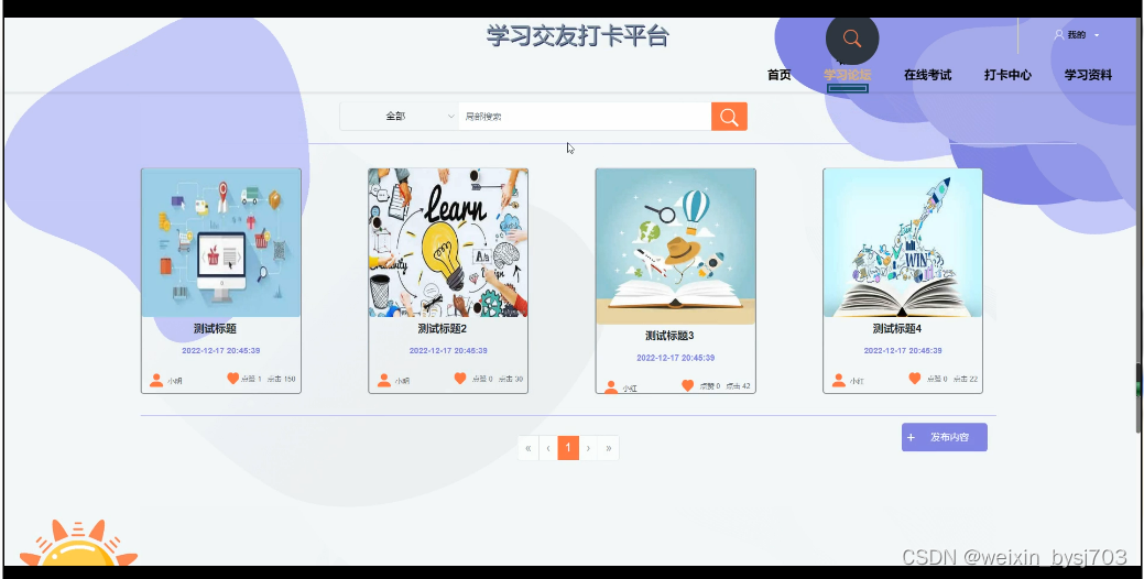 学习论坛,在学习论坛页面可以查看或发布分享图片、名称、标题、日期、内容等详细的学习资料信息,如图5-2所示。