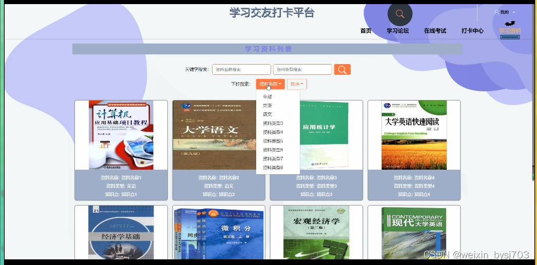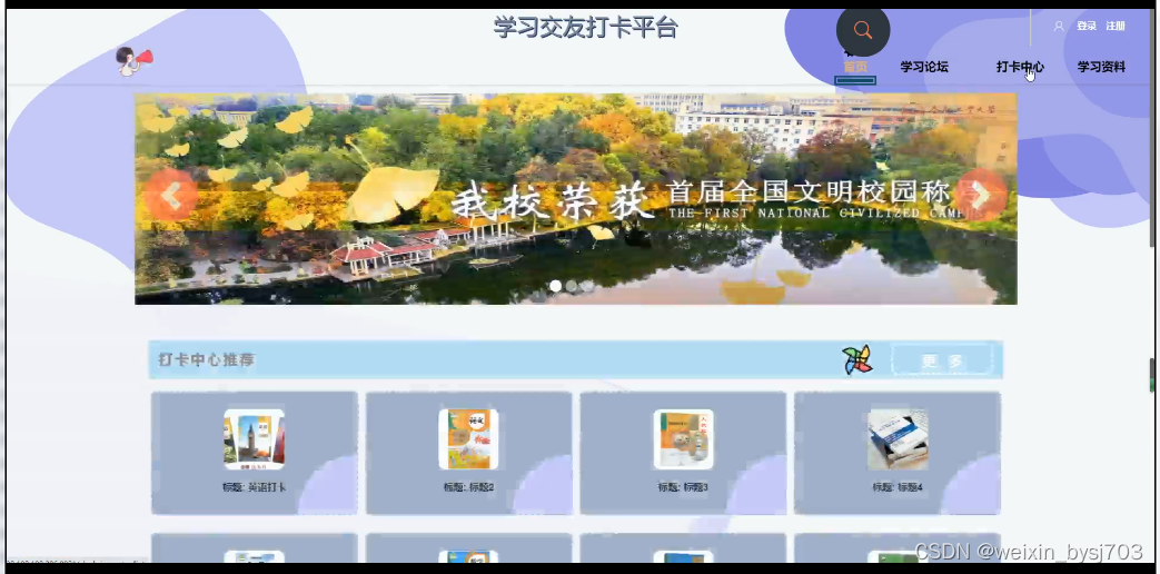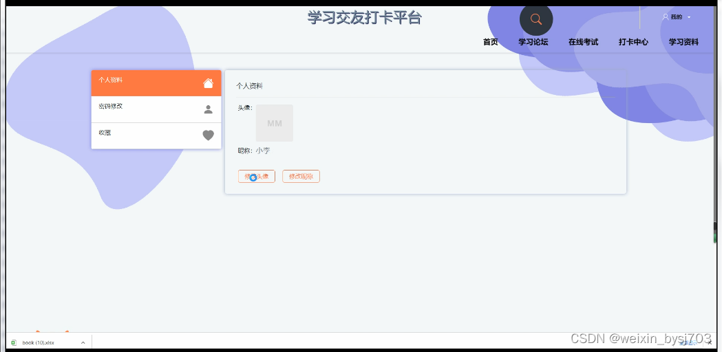 学习交友打卡平台,在系统首页可以查看首页、学习论坛、在线考试、打卡中心、学习资料、个人中心等内容,如图5-1所示。