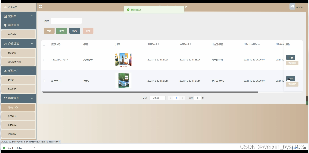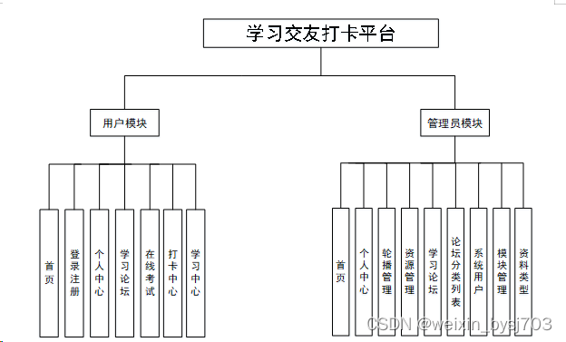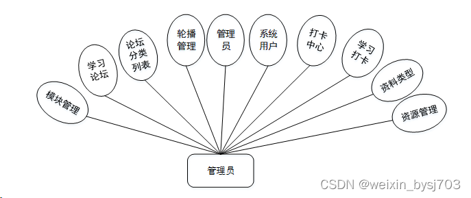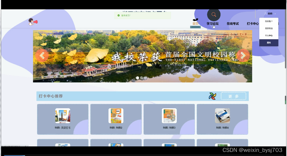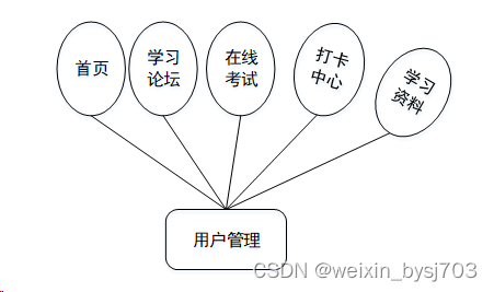 对于用户所使用的功能模块的操作主要首页、个人中心、学习论坛、在线考试、打卡中心、学习资料、后台管理等功能。