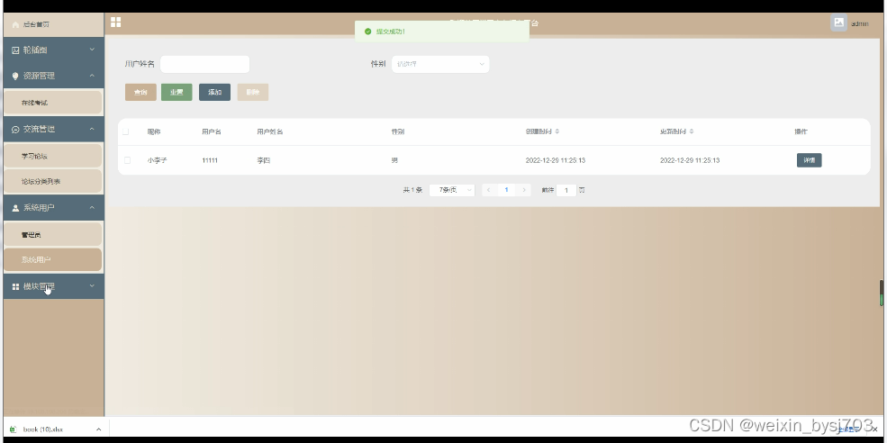 管理员登录进入学习交友打卡平台可以查看首页、个人中心、轮播管理、交流管理、模块管理、用户管理、资源管理等内容,如图5-7所示。