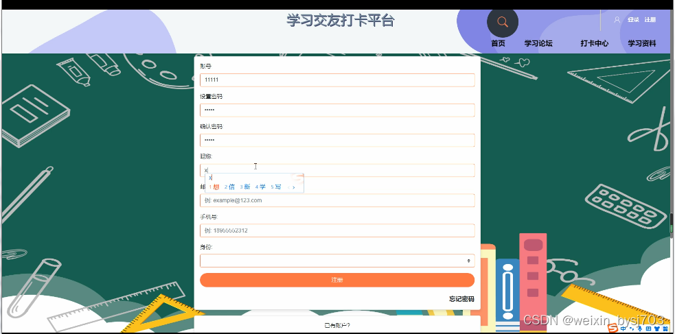 通过填写账号、设置密码、确认密码、昵称、邮箱、手机号、身份、用户编号、用户姓名等信息进行注册,输入完成后选择注册、登陆即可进入学习交友平台,如图5-11所示:
