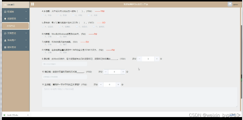 对于管理员可以使用的功能模块主要有首页、个人中心、用户管理、轮播管理、在线考试、交流管理、模块管理等功能。