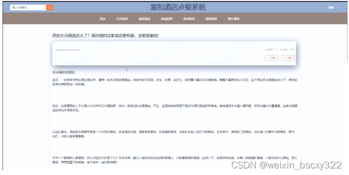 当访客点击宣和酒店点餐系统中导航栏上的“酒店资讯”后将会进入到该“酒店资讯”列表的界面,然后选择想要看的酒店资讯,点击进入到详细界面,同时可以进行点赞、收藏、评论操作,酒店资讯界面如下图4-5 所示。