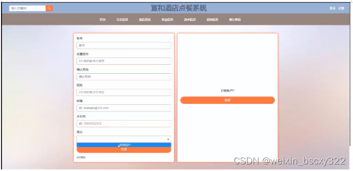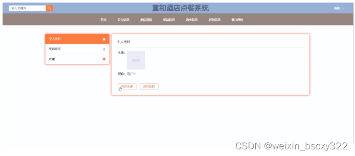 (1)用户注册登录:用户注册为用户并登录宣和酒店点餐系统;用户对个人信息的增删改查,比如个人资料,密码修改。