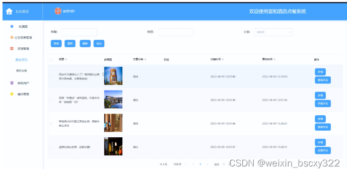 (2)资源管理:管理员可以对宣和酒店点餐系统前台展示的酒店资讯以及资讯分类所属的分类进行管控。