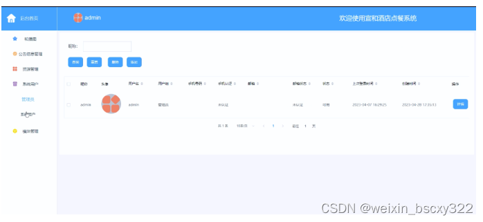 宣和酒店点餐系统中的管理人员是可以对前台注册的系统用户进行管理的,也可以对管理员进行管控。界面如下图4-8所示。