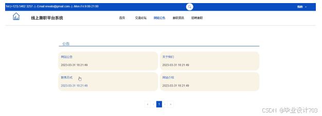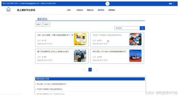 The main functional modules of the online part-time system include the system background homepage, rotation chart, website announcement management, resource management (part-time information, information classification), communication management (communication forum, communication classification), system users (administrators, registered users, business users), module management (job classification, recruitment part-time, part-time application, communication inquiry), Adopting an object-oriented development model for software development and hardware installation can well meet the actual use needs, improving the corresponding software installation and program coding work, mainly using MySQL as the main storage unit for background data, applying software engineering principles and development methods, and using Python's Django technology for business system coding and development, achieving all the functions of the system. This report first analyzes the background, role, and significance of the research, laying a foundation for the rationality of the research work. Analyze the various requirements and technical issues of the online part-time system, prove the necessity and technical feasibility of the system, and then provide a basic introduction to the technical software and design ideas needed to design the system. Finally, implement the online part-time system and deploy it for operation.