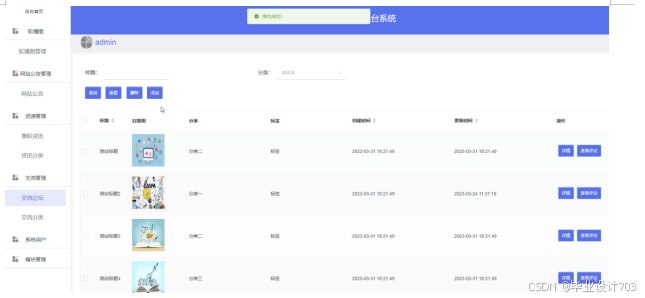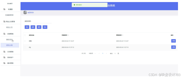 资源管理,在此页面可以查看兼职资讯、资讯分类的信息,进行查询、重置、删除、添加等操作。