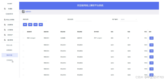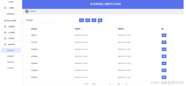 在模块管理页面,能查看职位分类、招聘兼职、兼职申请、交流询问的信息,并进行查询、重置、删除、添加等操作。