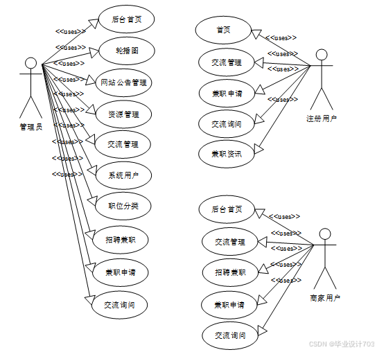 线上兼职平台系统的功能主要分为前台用户根据自己的需求进行注册登录,浏览职位信息并对选中的职位进行申请操作。后台系统管理员因职责的不同,分为普通管理员和超级管理员,普通管理员主要对申请单进行处理,而超级管理员主要对注册用户,新闻数据,职位详细信息,企业详细信息进行处理。