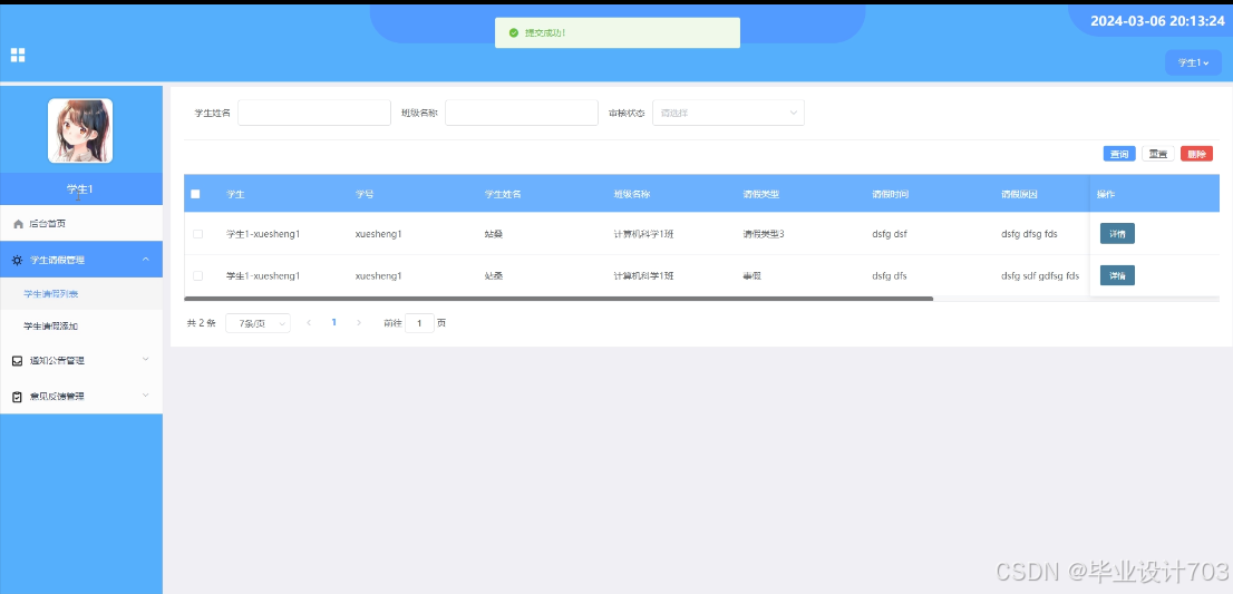 可查看提交的请假信息,进行增改删查操作,支持学生姓名、班级名称、审核状态搜索,点击可查看详情,填写请假信息(请假类型、请假时间、请假原因)并提交等待管理员审核。其界面如下图所示。