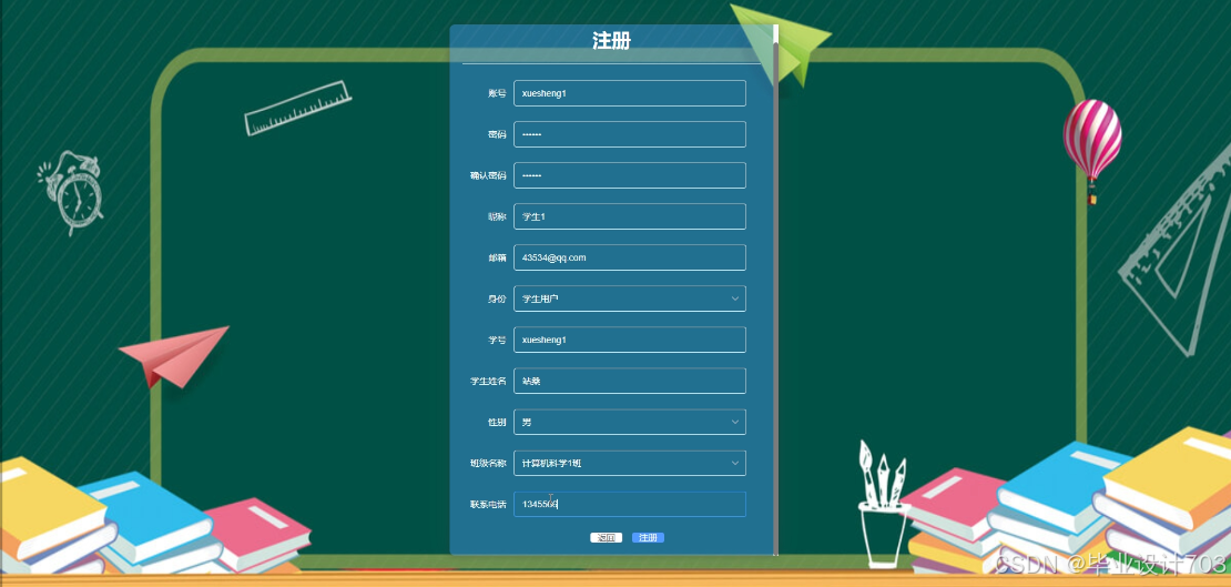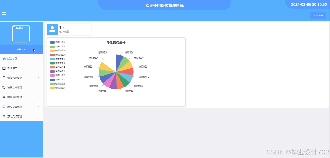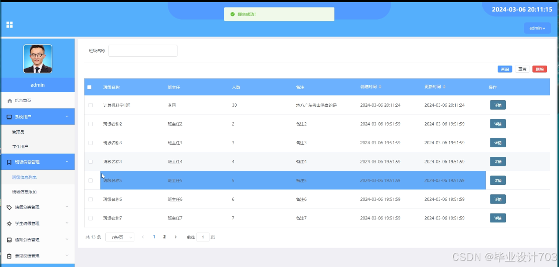随着教育信息化的发展,班级管理系统成为学校组织管理中不可或缺的一部分。传统的班级管理方式已经无法满足当今班级管理的需求。互联网的普及和信息技术的发展,也是班级管理得到了进一步的发展,因此,基于Java web的班级管理系统设计和实现十分重要。该系统的开发能够满足班级管理需求,促进班级管理信息化、数字化发展,班级管理系统具有后台首页、系统用户、班级信息管理、请假分类管理、学生请假管理、通知公告管理、意见反馈管理等功能,并将其数据整合在一起,实现了信息的集中管理和高效处理,为学生提供了意见反馈的渠道,并为管理班级的工作带来了许多便利,减轻时间和人力成本,简化班级管理的工作流程,提高工作效率。