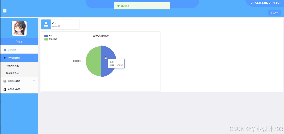 | 预期结果 | 提交以后,后台首页会显示新的学生请假信息 |