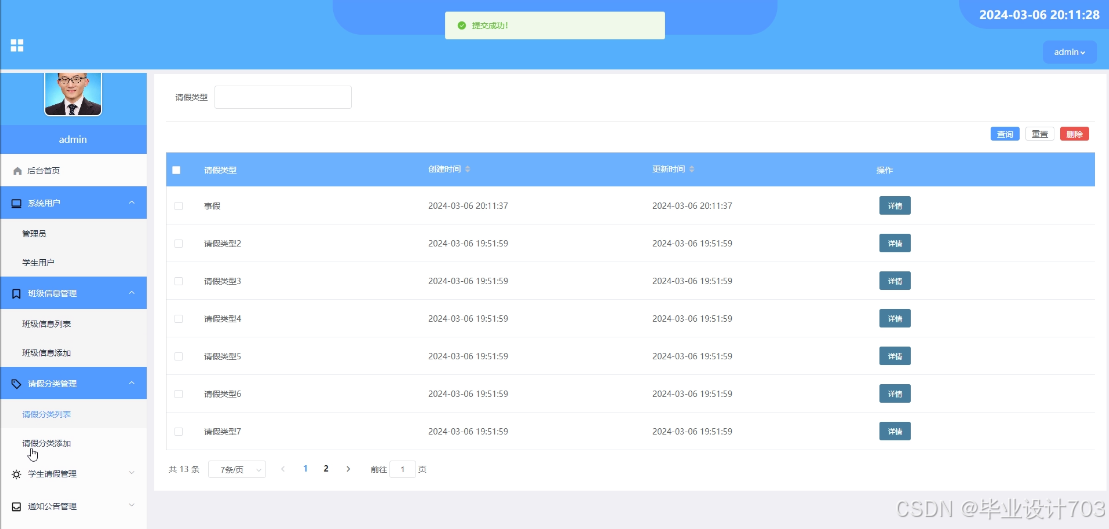 - 请假分类管理:可查看所有请假分类信息,进行增改删查操作,支持请假类型搜索,点击可查看详情。