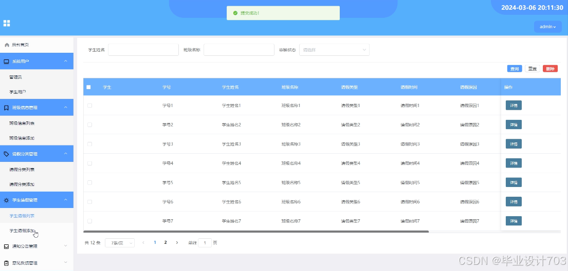 可查看所有学生请假信息,进行增改删查操作,支持学生姓名、班级名称、审核状态搜索,点击可查看详情(学生、学号、学生姓名、班级名称、请假类型、请假时间、请假原因、审核状态、审核回复)和进行审核。其界面如下图所示。