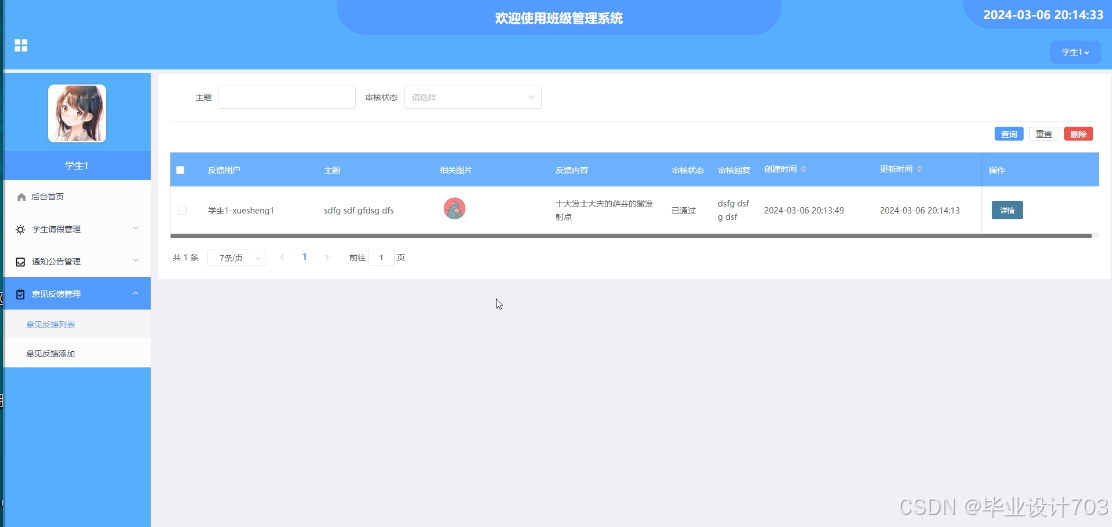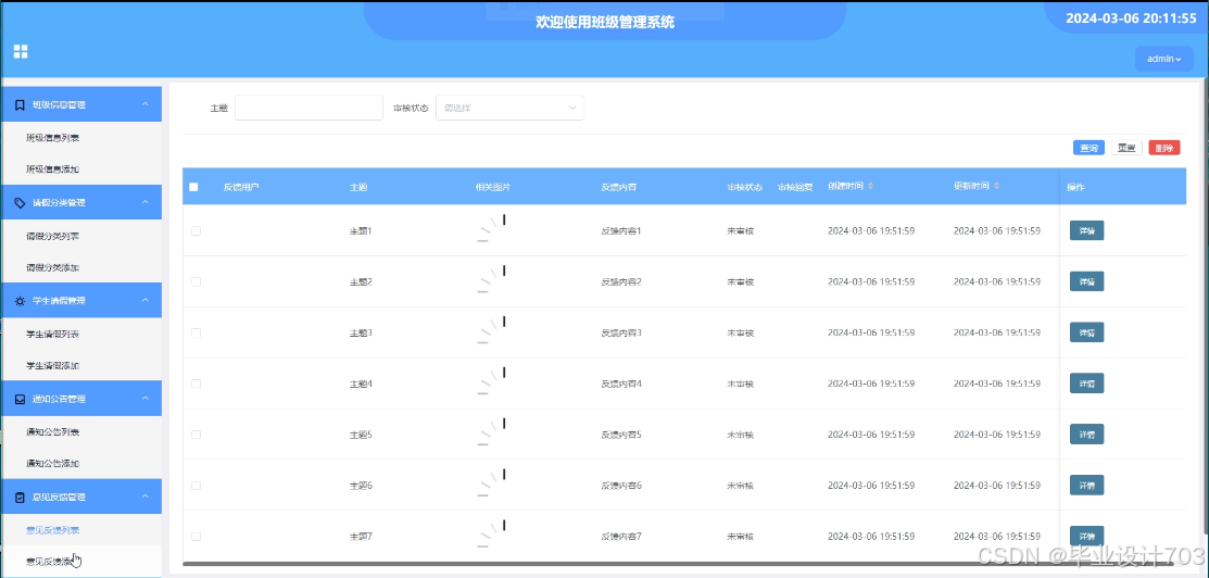 随着互联网的普及和信息技术的发展, 基于Java web的班级管理系统设计的开发具有积极意义。班级管理系统的设计与实现对于提高学校管理工作效率、提升教学质量、加强学生管理、提高教师工作满意度具有重要意义。该系统,为学生提供了更多获取通知公告的信息、进行请假和反馈意见的渠道,管理员可以更好地掌握班级和学生信息和请假情况,及时处理学生的请假事务,并收集学生的意见反馈,提升管理的水平,实现信息共享与交流,推动学校管理的现代化和智能化。同时,班级管理系统实现信息的集中管理和高效处理,提供一种清晰、可靠、实时的数据支持,提升班级管理的全面性和准确性,为班级管理工作带来了许多便利。