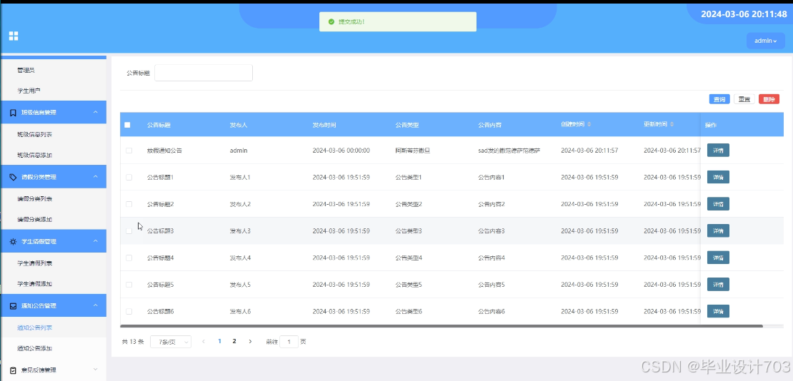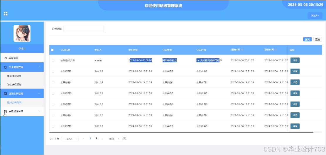 - 通知公告管理:可查看管理员发布的所有通知公告,支持公告标题搜索,可点击查看详情。