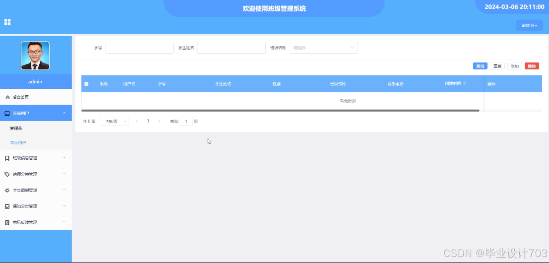 With the development of educational informatization, class management system has become an indispensable part of school organization and management. The traditional class management method can no longer meet the needs of current school management. With the popularization of the Internet and the development of information technology, class management has also been further developed. Therefore, the design and implementation of class management system based on Java web is very important. The development of this system can meet the needs of class management, promote the informatization and digital development of class management. The class management system has functions such as backend homepage, system users, class information management, leave classification management, student leave management, notification and announcement management, and feedback management. Its data is integrated together to achieve centralized management and efficient processing of information, providing students with channels for feedback, And it has brought many conveniences to the management of the class., Reduce time and labor costs, simplify the workflow of class management, and improve work efficiency.