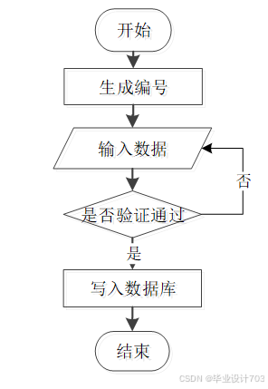 用户成功登入系统后就能够实现增加数据的操作,增加数据的编号由系统生成,用户不能随意填写,除了编号以外,其他增加信息用户自己填写,填写后的信息经过系统验证,验证通过后即可完成数据新增,数据新增的流程图如下图2-1所示。