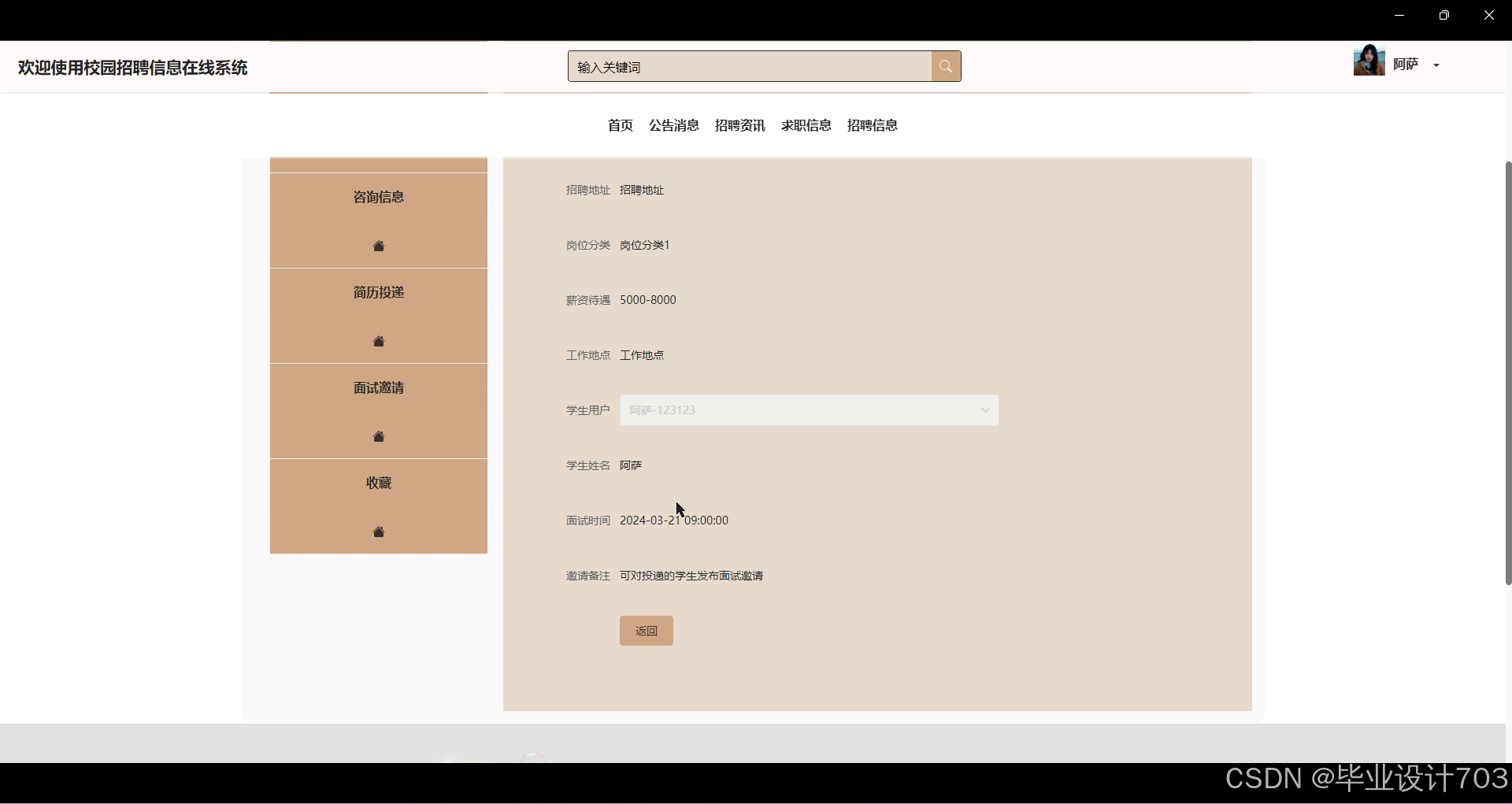 该系统为学生提供招聘资讯浏览、求职信息发布、简历投递、面试邀请管理等功能;企业用户可发布招聘信息、管理简历投递等;管理员负责系统数据统计、用户管理、招聘信息审核、公告发布等。系统功能齐全,操作简便,提升了学生求职效率、企业招聘管理便捷性和管理员数据管理效率,为校园招聘活动提供了有效支持。