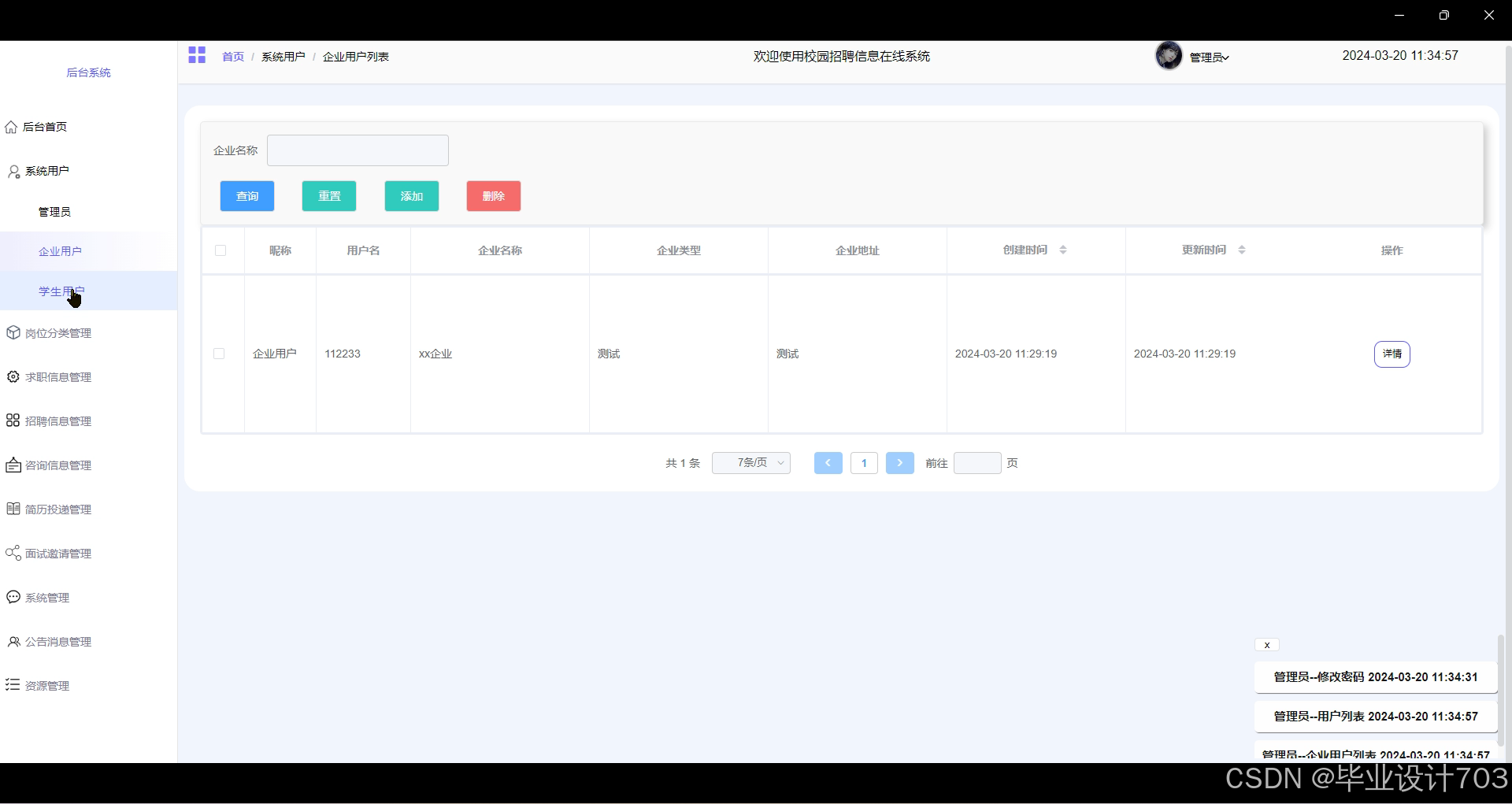 - 系统用户:管理员可以根据需要添加、编辑和删除企业用户和学生用户等信息。