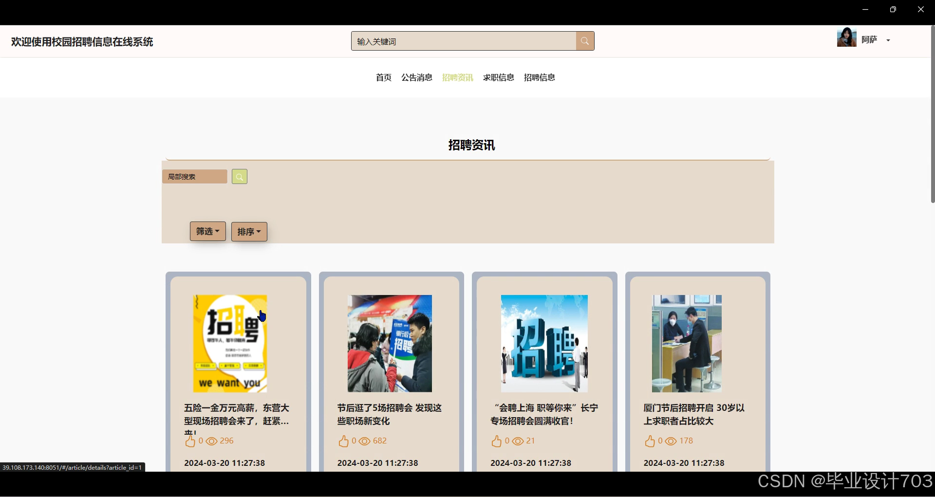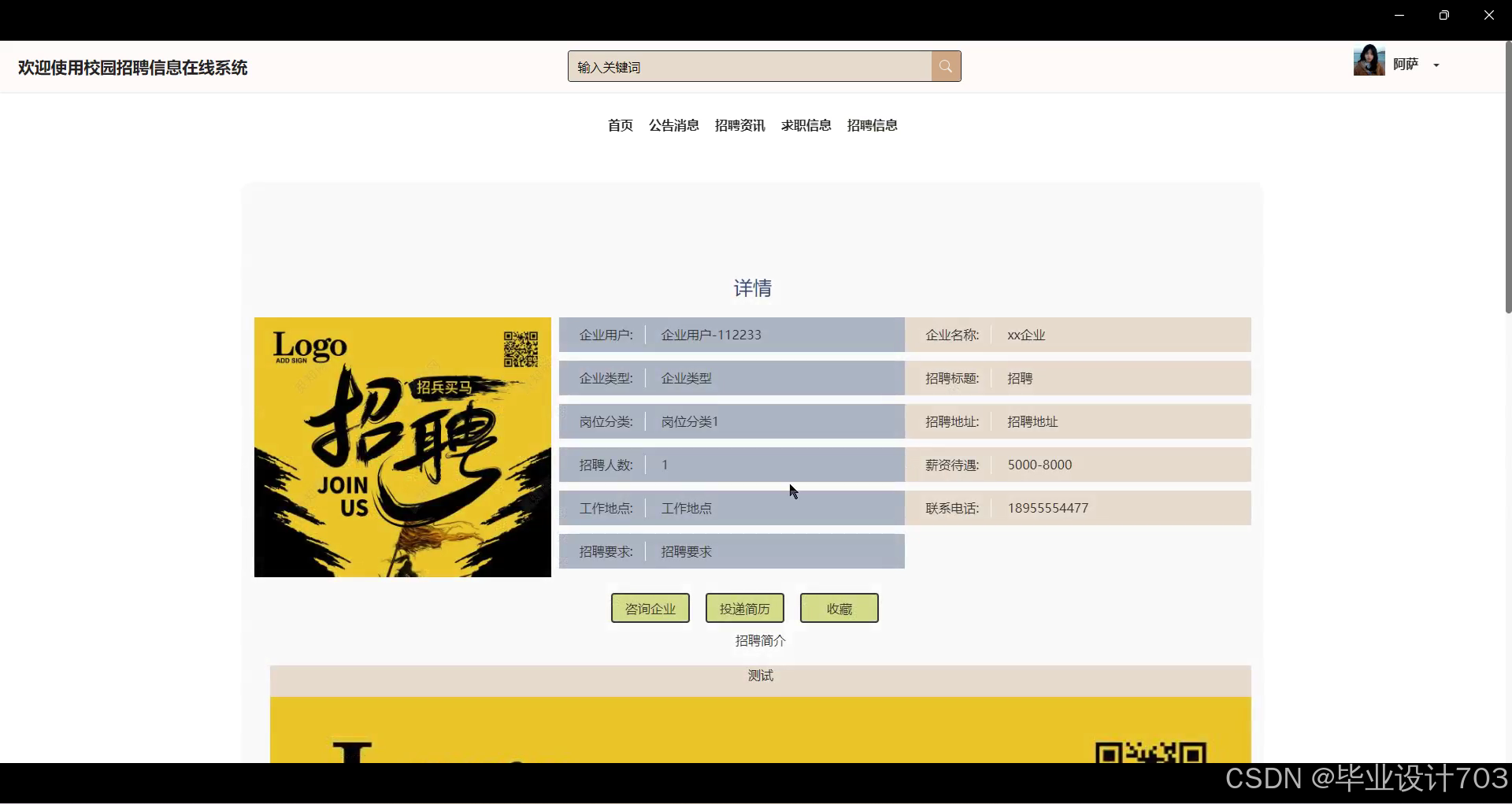 用户浏览最新的招聘信息,用户登录系统后进入招聘资讯页面,可以按分类浏览或搜索感兴趣的招聘信息。用户可以查看招聘职位、要求、薪资等详细信息,选择适合的职位进行查看或收藏。系统设计简洁直观,为用户提供了便捷的招聘信息浏览方式,帮助用户及时了解最新招聘动态,提高求职效率和成功率。界面如下图所示。