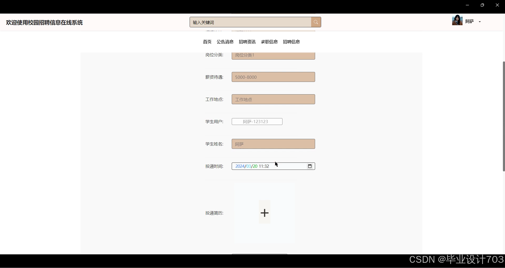 学生选择目标职位,上传个人简历,点击投递按钮。学生登录系统后进入简历投递页面,选择适合的职位,上传个人简历,并确认投递。系统验证简历格式和完整性后,将简历发送给对应企业。学生可查看投递状态和反馈。该功能设计简单高效,为学生提供了便捷的简历投递方式,提升求职成功率和与企业的沟通效率。界面如下图所示。