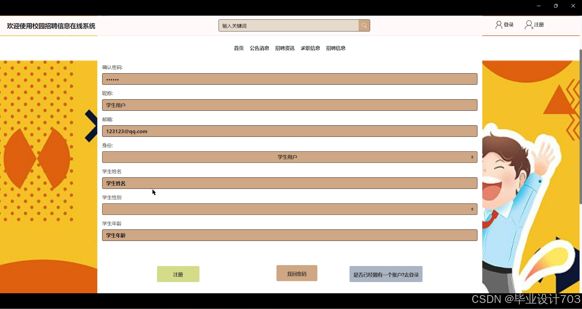学生用户注册时填写个人信息如用户名、密码、邮箱,点击注册按钮,系统验证信息有效性,发送确认邮件或短信,用户点击确认链接或验证码验证,系统确认注册信息有效后完成注册,生成用户账号,用户可登录系统进行操作。注册流程设计简洁明了,保证用户信息安全和准确性,提高用户注册流程的顺畅性和便捷性。界面展示如下图4.1所示。