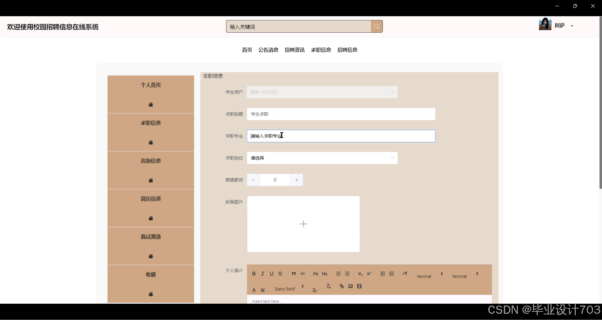 - 求职信息:学生可以填写个人求职信息,包括个人简介、求职意向等,以便企业浏览。