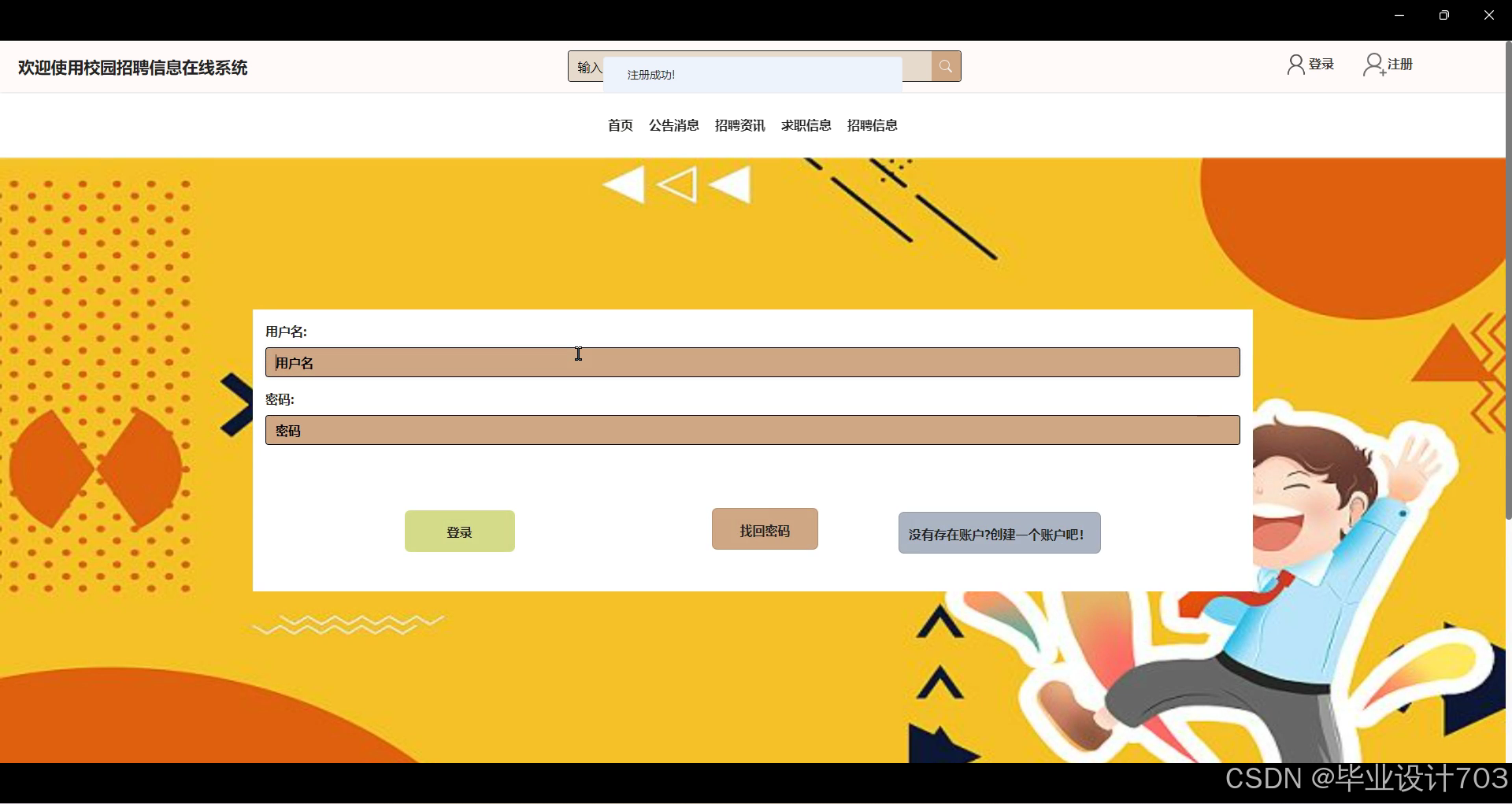 - 首页:展示最新的校园招聘信息和公告通知,提供快速导航入口。