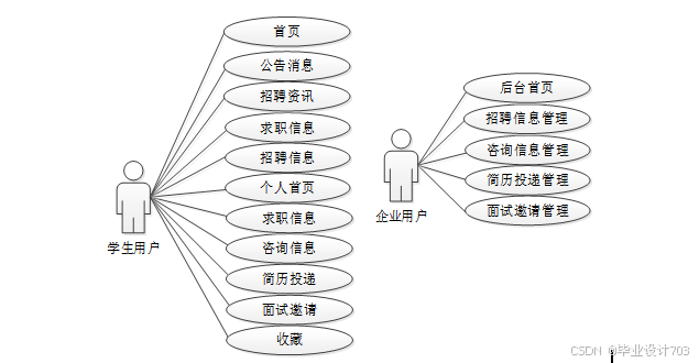 系统用例分析是对系统中各个功能模块的用户需求和行为进行分析,以识别和描述不同的用户用例。通过系统用例分析,可以深入了解用户在平台上的操作流程和交互方式,为系统设计和开发提供指导,并确保平台能够满足用户的需求和期望。校园招聘信息在线系统中用户角色用例图如图2.1所示: