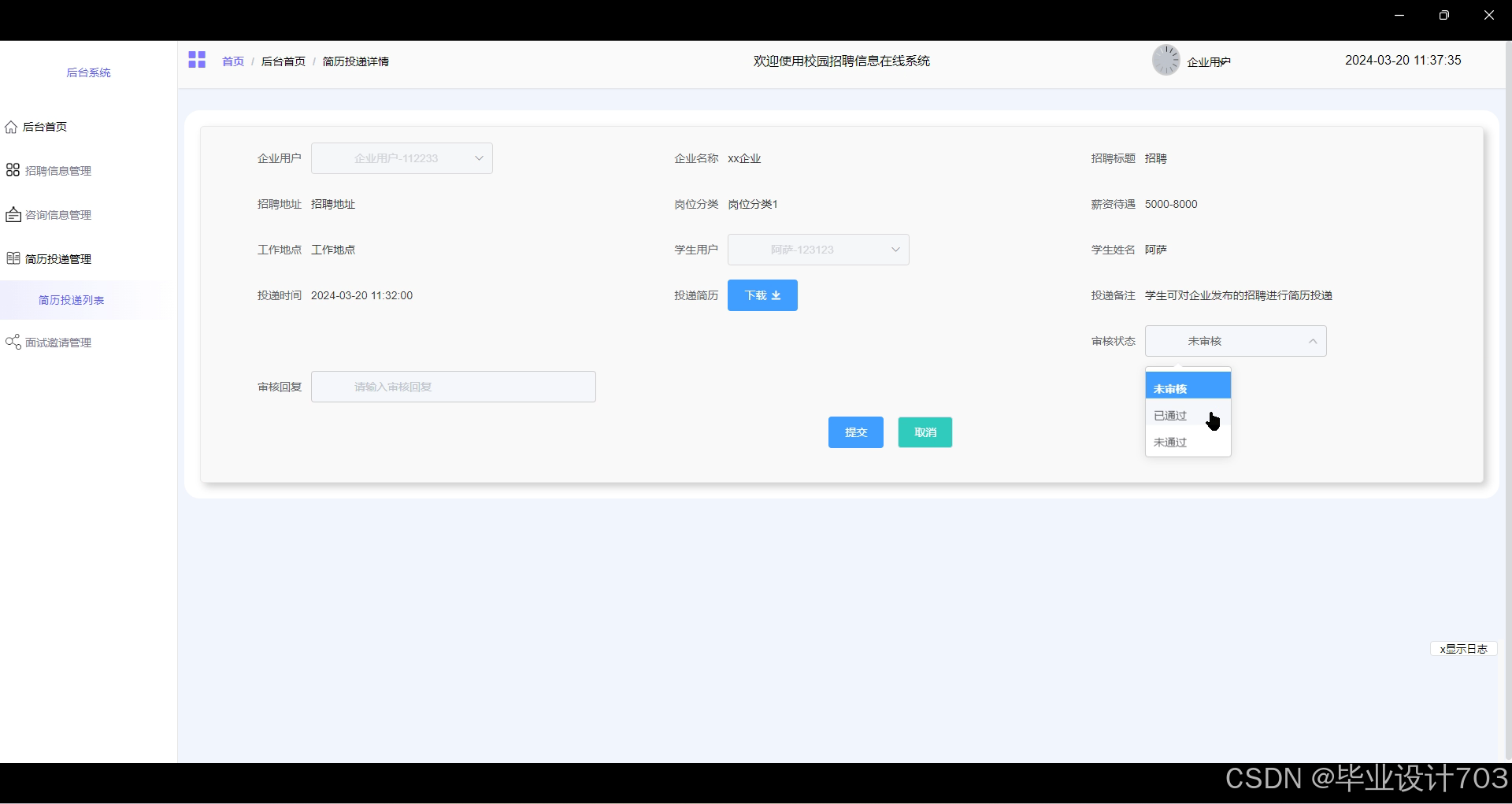 This system provides students with functions such as browsing recruitment information, publishing job search information, submitting resumes, and managing interview invitations; Enterprise users can publish recruitment information, manage resume delivery, etc; The administrator is responsible for system data statistics, user management, recruitment information review, announcement publishing, etc. The system is fully functional and easy to operate, which improves the efficiency of student job seeking, enterprise recruitment management, and administrator data management, providing effective support for campus recruitment activities.