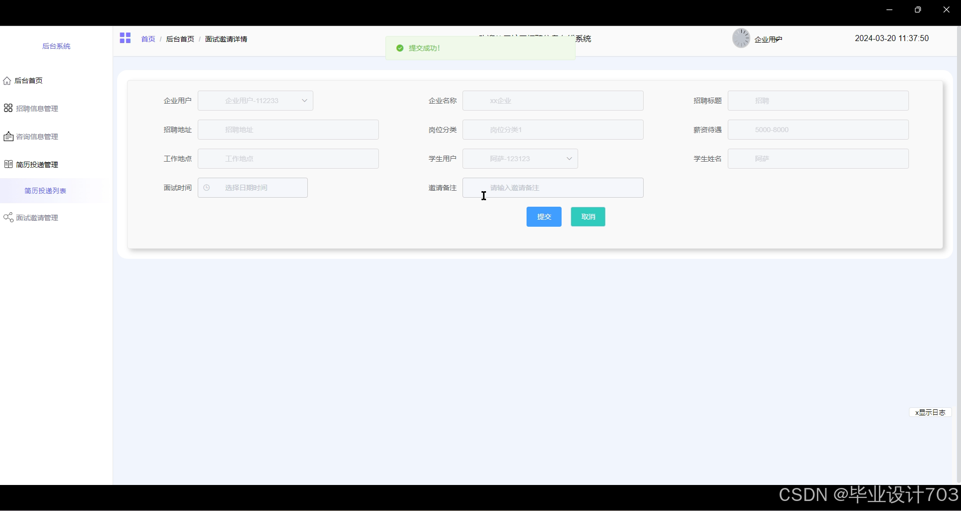 - 面试邀请管理:管理员审核和管理企业发送的面试邀请信息,促进企业与学生的沟通和面试安排。