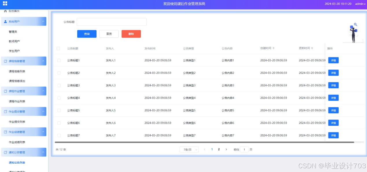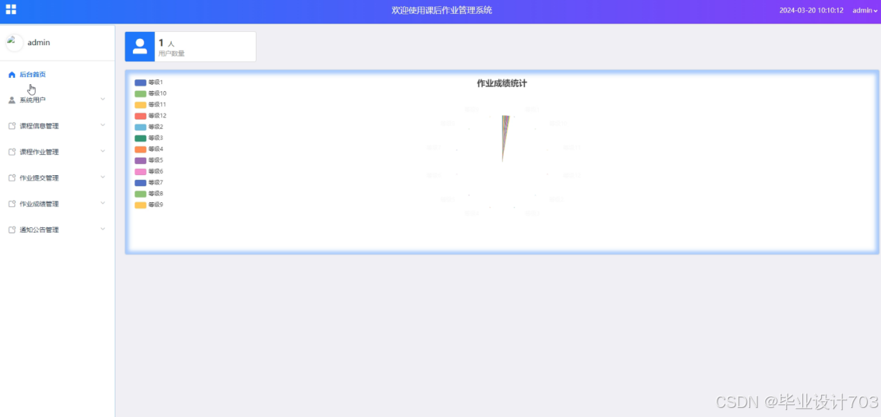3、该系统具有完善的功能,包括管理后台首页、系统用户(学生用户、管理员、教师用户)、程信息管理、课程作业管理、作业提交管理、作业成绩管理、通知公告管理等。此外,还提供了维护和更新模块的功能。