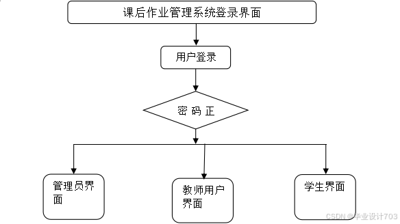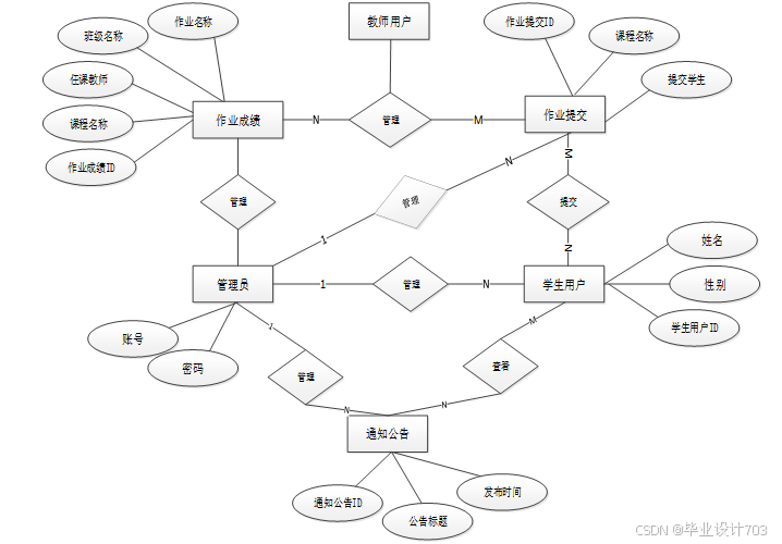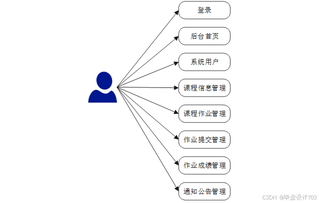 该系统聚焦于三大核心功能模块:用户管理、作业管理和课程信息管理。用户管理模块涵盖管理员、教师和学生三类用户,确保不同角色拥有相应的操作权限。作业管理模块包括学生作业提交以及作业成绩等功能,课程信息管理模块包括教师课程信息添加以及课程作业管理。