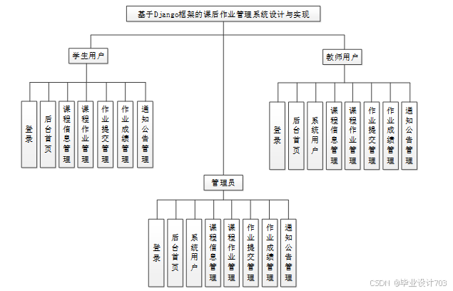 The system focuses on three core functional modules: user management, job management, and course information management. The user management module covers three users, administrators, teachers and students, ensuring that different roles have corresponding operation rights. The homework management module includes functions such as student homework submission and homework achievement, and the course information management module includes teacher course information addition and course homework management.