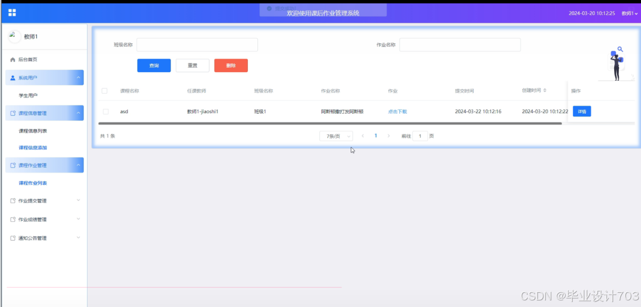 课程作业管理页面,教师用户可以查看到课程作业等详细信息,并可根据需要进行查询、修改或删除等操作,如图5-6所示。