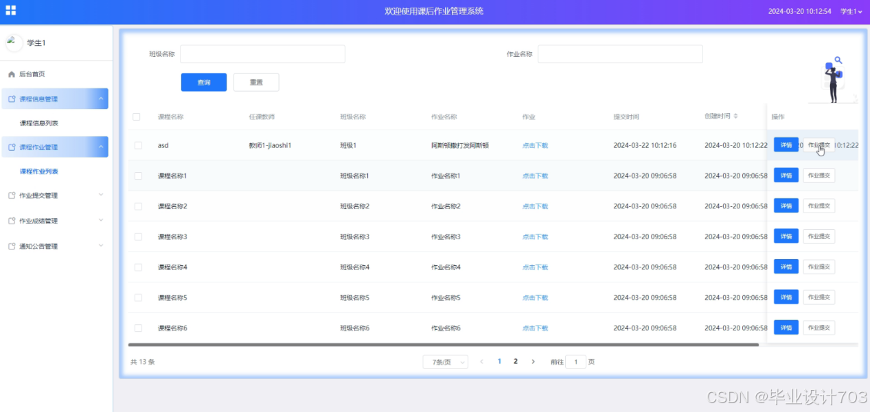 学生用户课程作业管理页面,学生用户可以在此页面查看课程作业和提交作业,如图5-7所示。