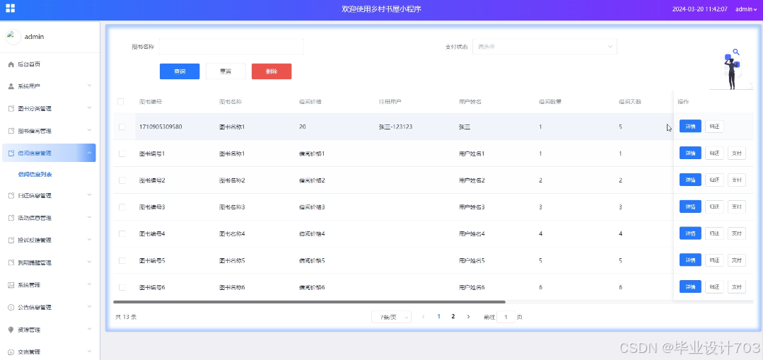- 借阅信息管理:可查看所有借阅信息,进行增改删查操作,支持图书名称、支付状态搜索,可点击查看详情,并可点击支付和归还操作。