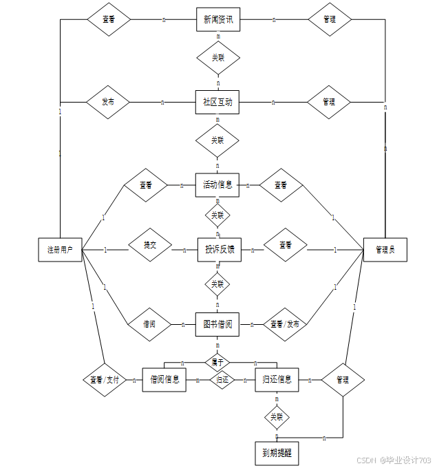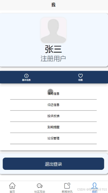 - 我的:可对基本信息、收藏、注册用户、图书分类、图书借阅、借阅信息、归还信息、活动信息、投诉反馈、到期提醒、论坛管理等信息进行管理。例如: