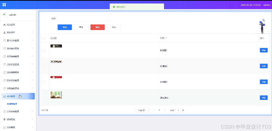 - 系统管理:可对首页的轮播图进行管理,进行增删改查操作,支持标题搜索,可点击查看详情。