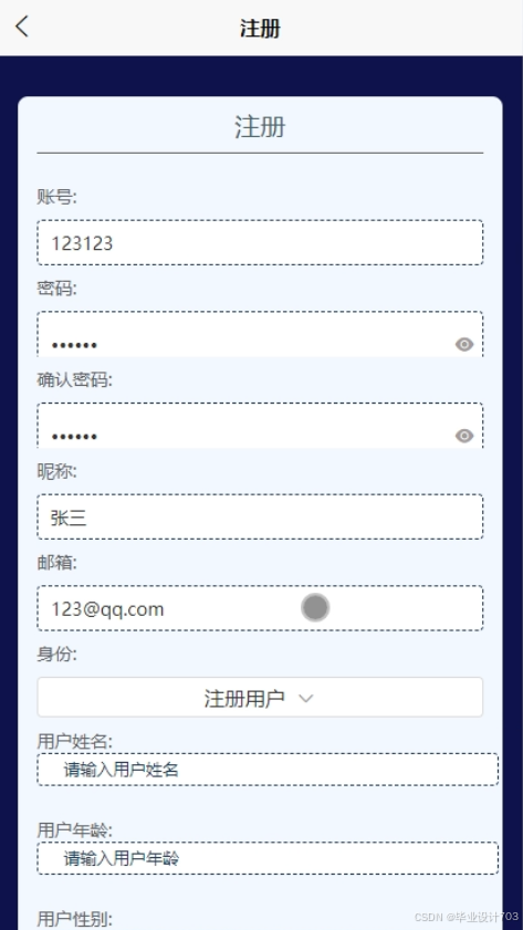 | 测试用例描述 | 使用者输入用户名、密码以及个人信息进行账号注册 | |
