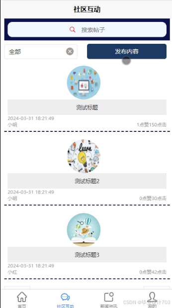 可查看所有社区互动消息,支持搜索帖子,点击可查看详情,可进行发布内容操作,并进行点赞、收藏和评论。界面如下图所示。