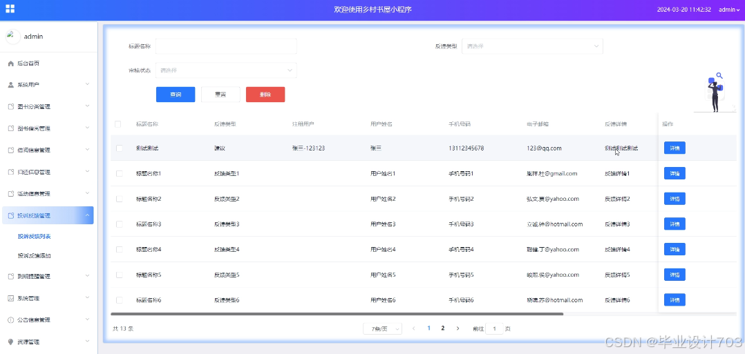- 投诉反馈管理:可查看所有投诉反馈信息,进行查询和删除操作,支持标题名称、反馈类型、审核状态搜索,可点击查看详情,进行审核。